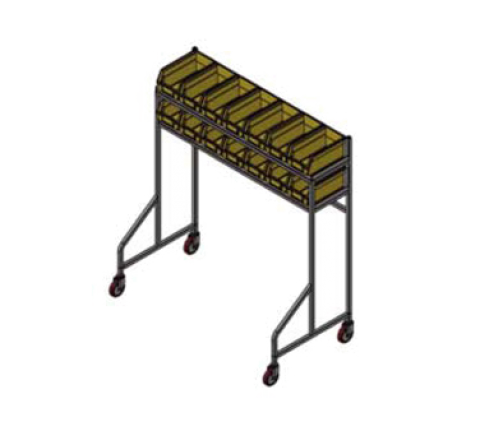 Starter station; all stainless steel tubular construction for cantilever or straddle use with set of 14 plastic storage bins with dividers for tray top components; 5" all swivel casters, 2 with brakes