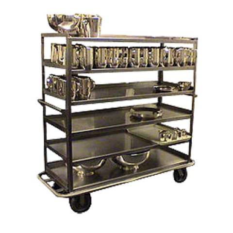 Queen Mary China & Silver Transporter, open design, 1200 lb weight, six shelves size 57" x 23-1/2", stainless steel angle frame, push handle, shelf clearance 9", 1-1/2" flange on 3 sides, 2 swivel, 2 rigid 8" casters, stainless steel, NSF