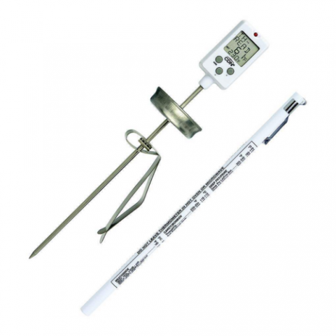 Digital Candy Thermometer, +14 to +450°F (-10 to +232°C), 0.875"W x 0.875"H display size, shatterproof, with (7) preprogrammed candy stages and (1) programmable all-purpose temperature setting, Dual progress display shows (2) temperatures — the set temperature and the current temperature, (2) LR44 batteries included, Auto shut-off after 1 hour, adjustable stainless steel clip, temperature guide on sheath, mounting: pocket clip, ABS plastic case