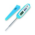 Thin Tip Pocket Thermometer, -40 to +450°F (-40 to +230°C), 6 second response, 7/8"W x 5/16"H (2.2 x 0.8cm) display, 1.5 mm thin tip, 2-3/4" (7.0 cm) stem, field calibration, waterproof, high heat, shatterproof, expanded range, data-hold, big digit, temperature guide on thermometer, on/off button, auto-off after 10 minutes, sheath can be used as handle extension, pocket clip/hook, requires (1) LR44 battery (included), food-safe ABS plastic with BioCote®, 304 stainless steel stem, blue, NSF