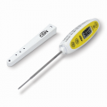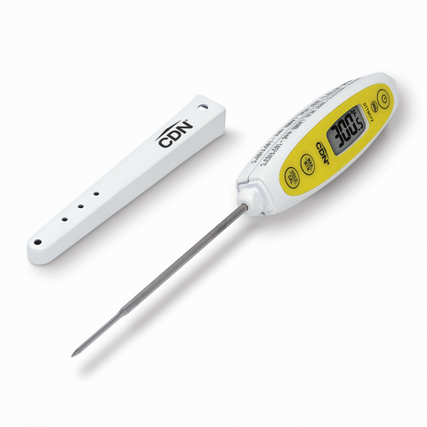 Thin Tip Pocket Thermometer, -40 to +572°F (-40 to 300°C), 4 second response, 47/50"W x 43/100"H (2.4 x 1.1cm) and 180° rotating display, 1.5 mm thin tip, 3-1/2" (8.9 cm) stem, field calibration, waterproof, high heat, shatterproof, expanded range, data-hold, big digit, temperature guide on thermometer, on/off button, auto-off after 10 minutes, sheath can be used as handle extension, pocket clip/hook, requires (2) LR44 batteries (included), food-safe ABS plastic with BioCote®, 304 stainless steel stem, yellow, NSF