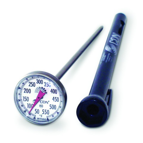 High Temperature Cooking Thermometer, 50 to 550°F, 1" (2.5cm) magnified dial, 5" (12.7cm) stem, waterproof, shatterproof, field recalibration, calibration tool on sheath, sheath can be used as handle extension, pocket clip, polycarbonate lens, food-safe ABS plastic with BioCote® on sheath, 304 stainless steel housing, NSF