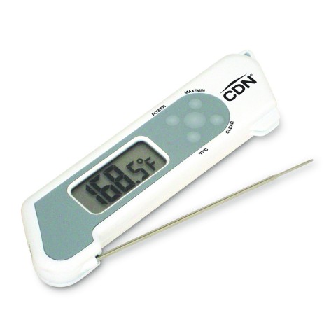 Folding Thermocouple Thermometer, -58 to +572°F (-50 to +300°C), 0.1°F/0.1°C resolution, ±1.8°F accuracy, 1-7/8"W x 3/4"H display, 4-1/4" (10.8cm) probe, 1.5mm tip, 3-6 second response, backlit in blue, field calibration, water resistant, shatterproof, max/min, extra big digit, on/off button, auto-off, temperature guide on thermometer, loop, requires (2) 3V IEC CR2032 batteries (included), food-safe ABS plastic with BioCote®, 304 stainless steel probe, White, NSF