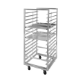 Oven Rack, Double Section, Standard Heavy-Duty Series, 29"W x 36"D x 69.75"H, Aluminum Construction, Side Load, 5" Angle Spacing, (24) 18" x 26" pans, 4" Swivel High Temp Phenolic Plate Casters w/ Zerk grease fitting model # CPS54H, Made in USA, NSF, 45lbs. (ITEM WEIGHT ONLY), CAD drawing will be supplied for approval, base oven rack model excludes lifting devices and pan stops, weight does not include 50 lbs. for pallet weight,