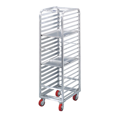 Bun Pan Rack, LifeTime Tough, EXTRA Heavy-Duty Series, 22"W x 26"D x 70"H, Aluminum Construction, End Load, 5" Angle Spacing, (12) 18" x 26" or (24) 13" x 18" pans (2 per shelf), 5" x 2" Heavy-Duty Swivel Plate Casters w/ Zerk Grease Fitting model # CPS25U, Made in USA, NSF, 42lbs. (ITEM WEIGHT ONLY), weight does not include 50 lbs. for pallet weight