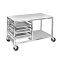 Bun Pan Rack, Work Table - Double Section, Angle Slides & Open Shelf, 48"W x 24"D x 31.5"H, Aluminum Construction w/ Poly Top, End Load, 5" Angle Spacing, (4) 18" x 26" or (8) 13" x 18" pans (2 per shelf), 5" Swivel Stem Casters model # CSS45O, Made in USA, NSF, 59lbs. (ITEM WEIGHT ONLY), weight does not include 50 lbs. for pallet weight