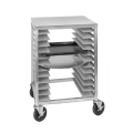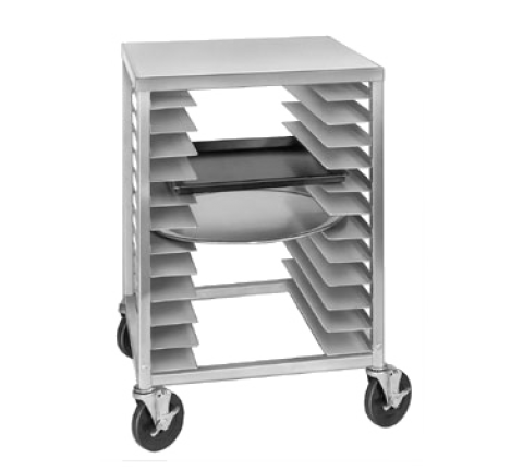 Pizza Equipment, Pizza Pan / Dough Box Rack, Pizza Pan 1/2 Size Rack – Under Counter / No Top, 22"W x 20"D x 30.5"H, Aluminum Construction, End Load, 2" Angle Spacing, (11) 17" to 19" round or 16" to 17" square pizza pans, 5" Swivel Stem Casters model # CSS45O, Made in USA, NSF, 35lbs. (ITEM WEIGHT ONLY), weight does not include 50 lbs. for pallet weight