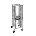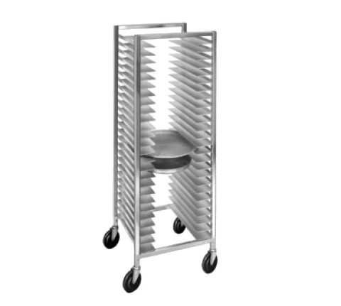 Pizza Equipment, Pizza Pan / Dough Box Rack, Pizza Pan 1/2 Size Rack – Aluminum Top, 43"W x 20"D x 32.5"H, Aluminum Construction, End Load, 2" Angle Spacing, (24) 17" to 19" round or 16" to 17" square pizza pans, 5" Swivel Stem Casters model # CSS45O, Made in USA, NSF, 73lbs. (ITEM WEIGHT ONLY), weight does not include 50 lbs. for pallet weight