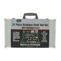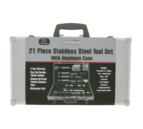 Mr. Bar-B-Q® Silver Prestige Barbeque Tool Set, (21) piece, includes: 4-in-1 spatula, fork, tongs, basting brush, knife, (4) skewers, (8) corn holders, grill brush, (1) replacement head, salt & pepper shaker, stainless steel, aluminum case, 5 year warranty (Patented) (must be purchased in case quantities)
