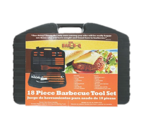 Mr. Bar-B-Q® Premium Barbeque Tool Set, (18) piece, includes: 3-in-1 spatula, tongs, fork, knife, basting brush, grill brush, (4) skewers, & (8) corn holders with carrying case, extra long finger grip wood handles, stainless steel (must be purchased in case quantities)
