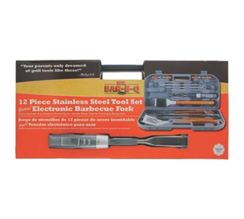 Mr. Bar-B-Q® Grilling Tool Set, (12) piece, includes: 4-in-1 spatula, tongs, Thermo fork, grill brush, 4 skewers and 4 corn holders with carrying case (must be purchased in case quantities)