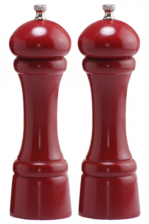 (086021) Autumn Hues Professional Pepper Mill & Salt Mill Set, 8" high, wood, tempered stainless steel gear, ceramic salt grinding mechanism, Made in USA, lifetime warranty, candy apple red