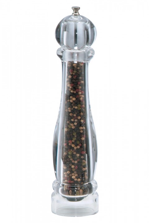 (296123) Chef Professional Series Ultima Pepper Mill, 12" high, stainless steel grinding mechanism, clear acrylic, "comes filled in the U.S.A", lifetime warranty