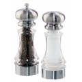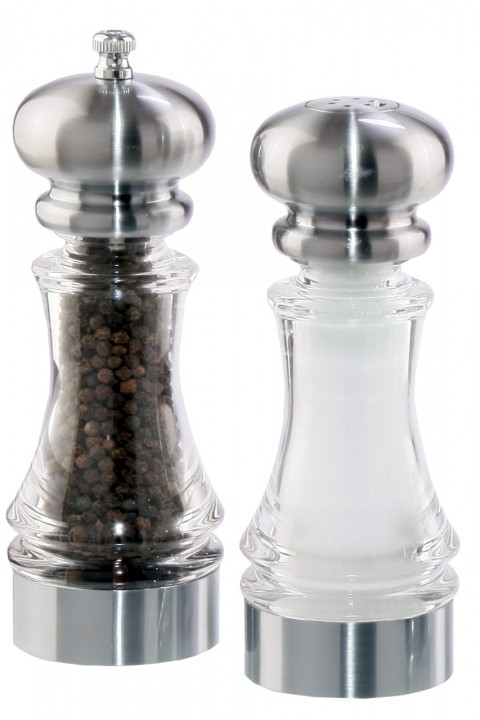 (968518) Chef Home Cookin' Series Lehigh Salt Shaker/Pepper Mill Set, 7" high, filled with pepper and salt, long lasting mechanism, "comes filled in the U.S.A", lifetime warranty, chrome/acrylic finish
