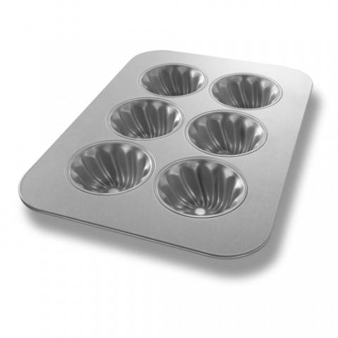 Mini-Swirl Cake Pan, 11-1/8" x 15-3/4" overall, makes (6) 3-11/16" cakes, 8.1 oz. capacity each, curled rim, hand wash recommended, 22 gauge panel/26 gauge cups, aluminized steel, AMERICOAT® ePlus silicone glaze, PFOA free, made in the USA with global materials (product has been discontinued and limited inventory is available)