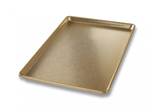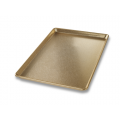 Display Pan, half size, 11-15/16" x 17-15/16" x 13/16", textured, semi-closed rim, no wire, 16 gauge anodized aluminum, gold finish, made in the USA with global materials