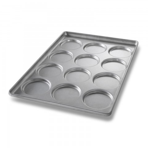 Hamburger Bun Pan, 17-3/4" x 25-3/4" x 1-1/2" overall, (12) 5" round compartments, band in rim, hand wash recommended, 22 gauge aluminized steel, AMERICOAT® ePlus silicone glaze, PFOA free, made in the USA with global materials