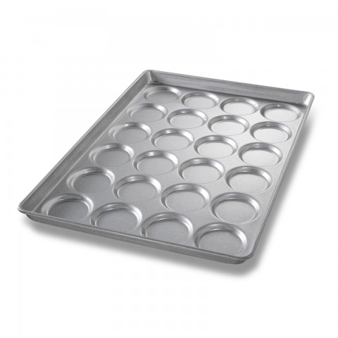 ePAN® Hamburger Bun Pan, 17-3/4" x 25-3/4" x 1-1/3", (24) 3-3/4" round compartments, wire in rim, hand wash recommended, 26 gauge aluminized steel, AMERICOAT® ePlus silicone glaze, PFOA free, made in the USA with global materials