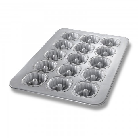 Mini Fluted Tube Cake Pan, 17-7/8" x 25-7/8" overall, makes (15) 3-15/16" dia. cakes, 7.5 oz. capacity each, wire in rim with tube, hand wash recommended, 22 gauge aluminized steel, AMERICOAT® ePlus silicone glaze, PFOA free, made in the USA with global materials