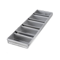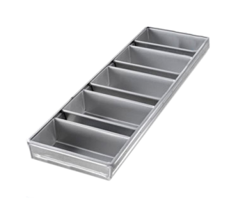 Bread Pan Set, 5-pan, 8-5/32" x 25-3/4" x 2-1/4" overall, (5) 7-3/8" x 3-5/8" strapped pans, wire in rim, band over wire, folded construction, hand wash recommended, 26 gauge aluminized steel, AMERICOAT® ePlus silicone glaze, PFOA Free, made in the USA with global materials
