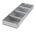 Bread Pan Set, 4-pan, 9-3/16" x 26" x 3" overall, (4) 8-1/2" x 5-3/4" strapped pans, wire in rim, band over wire, folded construction, hand wash recommended, 26 gauge aluminized steel, AMERICOAT® ePlus silicone glaze, PFOA Free, made in the USA with global materials