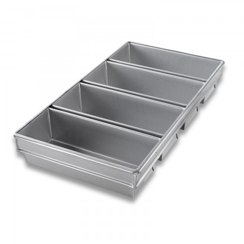 Bread Pan Set, 4-pan, 12-11/16" x 23-3/8" x 3-1/2" overall, (4) 12" x 5" strapped pans, wire in rim, band over wire, folded construction, hand wash recommended, 26 gauge aluminized steel, AMERICOAT® ePlus silicone glaze, PFOA Free, made in the USA with global materials