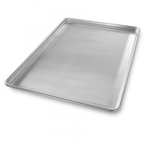 Stayflat® Sheet Pan, full-size, 17-7/8" x 25-13/16" x 1", .125" dia. bottom perforation, wire in rim, 18 gauge aluminum, plain, made in the USA with global materials