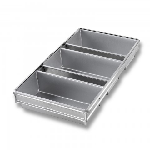 Bread Pan Set, 3-pan, 9-23/32" x 17-3/4" x 2-3/4" overall, (3) 9" x 4-1/2" strapped pans, folded construction, wire in rim, band over wire, hand wash recommended, 26 gauge aluminized steel, AMERICOAT® ePlus silicone glaze, PFOA Free, made in the USA with global materials