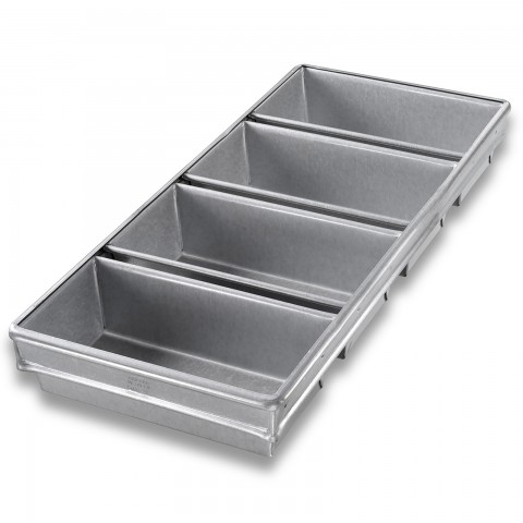 Bread Pan Set, 4-pan, 9-23/32" x 21-7/8" x 2-3/4" overall, (4) 9" x 4-1/2" strapped pans, wire in rim, band over wire, folded construction, hand wash recommended, 26 gauge aluminized steel, AMERICOAT® ePlus silicone glaze, PFOA Free, made in the USA with global materials