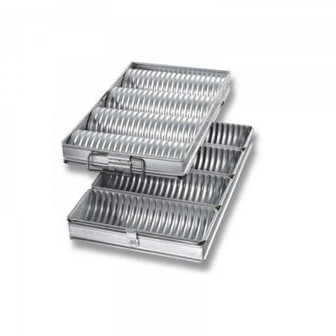 Crimped Round Bread Pan Set, 4-pan, 10-17/32" x 17-1/4" overall, (4) 10" x 3-3/4" dia. crimped loaves, 2-piece locking, wire in rim, hand wash recommended, 26 gauge aluminized steel, AMERICOAT® ePlus silicone glaze, PFOA Free, made in the USA with global materials