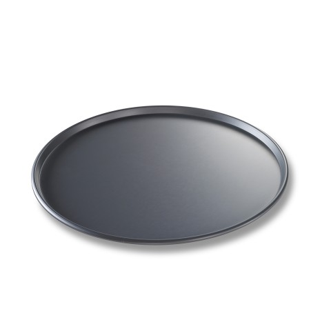 BĀKALON Thin Crust Pizza Pan, 14" dia. x 3/8" deep, hand wash only, 14 gauge hardcoat anodized aluminum, pre-seasoned, made in the USA with global materials