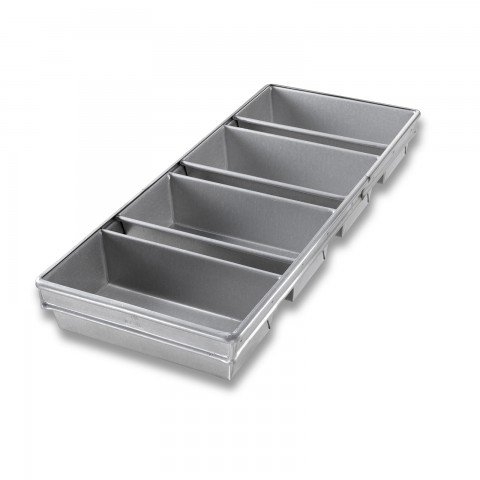 Bread Pan Set, 4-pan, 10-23/32" x 26" x 3" overall, (4) 10" x 5" strapped pans, wire in rim, band over wire, folded construction, hand wash recommended, 26 gauge aluminized steel, AMERICOAT® ePlus silicone glaze, PFOA Free, made in the USA with global materials
