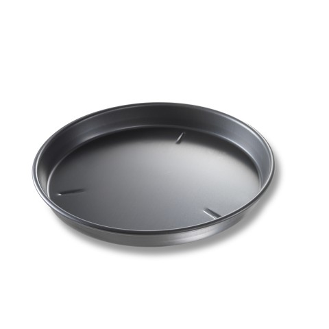 BĀKALON Deep Dish Pizza Pan, 13" dia. x 1-1/2" deep, nestable, embossed feet, hand wash only, 14 gauge hardcoat anodized aluminum, plain, made in the USA with global materials