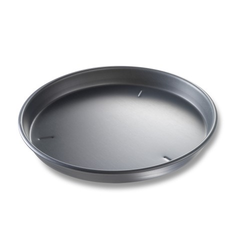BĀKALON Deep Dish Pizza Pan, 15" dia. x 1-1/2" deep, nestable, embossed feet, hand wash only, 14 gauge hardcoat anodized aluminum, plain, made in the USA with global materials