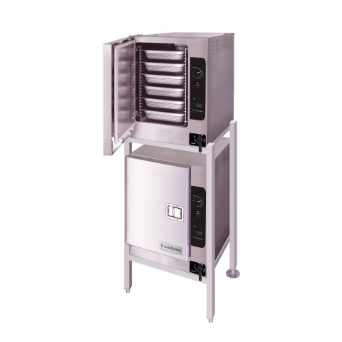 SteamChef™ 6 Convection Steamer, electric, boilerless, double stacked, on 111467E Stacking Stand (includes kit P/N 111170), (6) full size pan capacity per compartment, SureCook controls, easyTimer 90-minute timer with dial and LED digital readout in minutes and seconds, includes SureCook load compensating thermostat, manual cooking mode and descale indicator, bypass switch, left-hand hinged door, controls on right, automatic drain & water level controls, KleanShield™ interior, standard treated & tap water connection, stainless steel exterior, 4" adjustable legs with flanged feet, (2) 32,000 BTU, UL, NSF, ENERGY STAR®