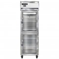 Freezer, display, one-section, self-contained refrigeration, stainless steel exterior, aluminum interior, standard depth, narrow hinged glass half doors, cylinder locks, electronic control with digital display, unit can be adjusted to operate as low as -10°F, hi-low alarm, electric condensate evaporator, R290 hydrocarbon, 1/2 HP, cETLus, NSF