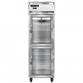Refrigerator, reach-in display, one-section, self-contained refrigeration, stainless steel exterior, aluminum interior, standard depth, narrow hinged glass half doors, cylinder locks, electronic control with digital display, hi-low alarm, electric condensate evaporator, R290 Hydrocarbon refrigerant, 1/4 HP, cETLus, NSF, ENERGY STAR®