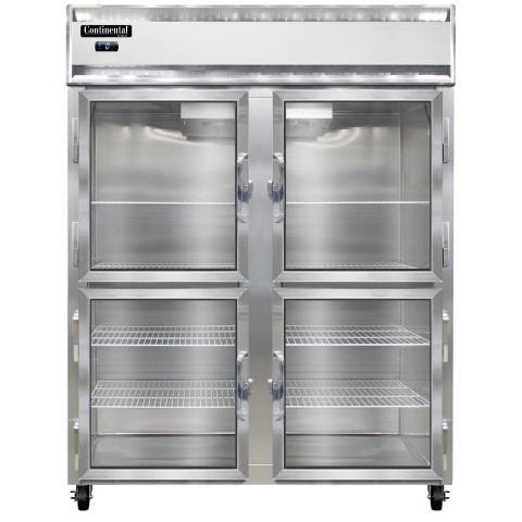 Extra-Wide Freezer, reach-in, 57"W, two-section, 50 cu. ft. capacity, self-contained refrigeration, (4) hinged self-closing glass doors (half height), (8) epoxy coated steel shelves, aluminum end panels & interior, stainless steel front, standard depth, electronic control with digital display, hi-low alarm, electric condensate evaporator, R290 Hydrocarbon refrigerant, 1-1/4 HP, cETLus, NSF