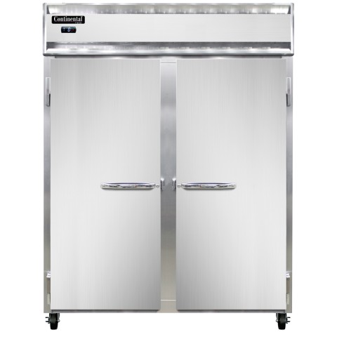 Extra-Wide Freezer, pass-thru, 57"W, two-section, self-contained refrigeration, stainless steel front, aluminum interior & ends, standard depth, full-height solid doors, cylinder locks, electronic control with digital display, hi-low alarm, electric condensate evaporator, R290 Hydrocarbon refrigerant, 1 HP