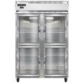 Freezer, display, two-section, self-contained refrigeration, aluminum exterior & interior, stainless steel front, standard depth, narrow hinged glass half doors, cylinder locks, electronic control with digital display, hi-low alarm, electric condensate evaporator, R290 Hydrocarbon refrigerant, 1-1/4 HP, cETLus, NSF