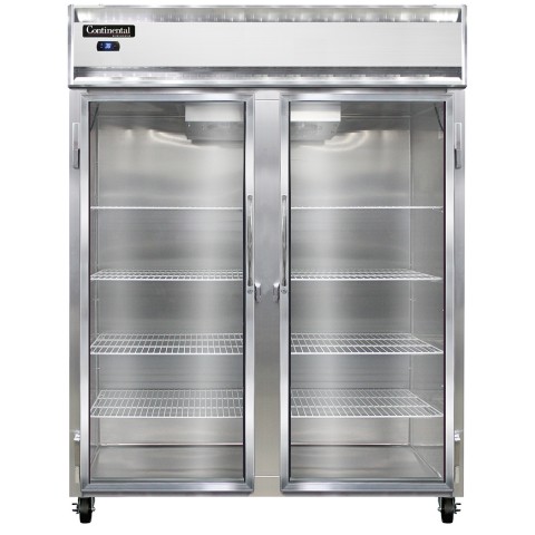 Extra-Wide Refrigerator, reach-in, 57"W, two-section, self-contained refrigeration, aluminum exterior & interior, stainless steel front, shallow depth, full-height glass doors, cylinder locks, electronic control with digital display, hi-low alarm, R290 hydrocarbon refrigerant, 1/3 HP, cETLus, NSF