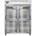 Extra-Wide Refrigerator, reach-in, 57"W, two-section, self-contained refrigeration, aluminum exterior & interior, stainless steel front, shallow depth, wide half-height glass doors, cylinder locks, electronic control with digital display, hi-low alarm, R290 hydrocarbon refrigerant, 1/3 HP, cETLus, NSF