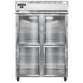 Refrigerator, reach-in display, two-section, self-contained refrigeration, stainless steel exterior, aluminum interior, standard depth, narrow hinged glass half doors, cylinder locks, electronic control with digital display, hi-low alarm, electric condensate evaporator, R290 hydrocarbon refrigerant, 1/3 HP, cETLus, NSF, ENERGY STAR®