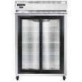 Refrigerator, reach-in display, two-section, self-contained refrigeration, stainless steel exterior, aluminum interior, standard depth, narrow sliding glass doors, cylinder locks, electronic control with digital display, hi-low alarm, electric condensate evaporator, R290 Hydrocarbon refrigerant, 1/3 HP, cETLus, NSF