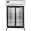 Refrigerator, reach-in display, two-section, self-contained refrigeration, aluminum exterior & interior, stainless steel front, shallow depth, narrow sliding glass doors, cylinder locks, electronic control with digital display, hi-low alarm, R290 Hydrocarbon refrigerant, 1/3 HP, cETLus, NSF