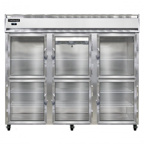 Extra-Wide Freezer, reach-in, 82-1/4" three-section, self-contained refrigeration, aluminum exterior & interior, stainless steel front, standard depth, wide half-height glass doors, cylinder locks, electronic control with digital display, hi-low alarm, electric condensate evaporator, R290 Hydrocarbon refrigerant, 1-1/4 HP, cETLus, NSF