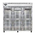 Freezer, display, three-section, self-contained refrigeration, aluminum exterior & interior, stainless steel front, standard depth, narrow hinged glass half doors, cylinder locks, electronic control with digital display, hi-low alarm, electric condensate evaporator, R290 Hydrocarbon refrigerant, 1-1/4 HP, cETLus, NSF