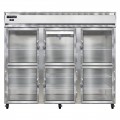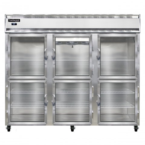 Extra-Wide Refrigerator, reach-in, 85-1/2"W, three-section, self-contained refrigeration, aluminum exterior & interior, stainless steel front, standard depth, wide half-height glass doors, cylinder locks, electronic control with digital display, hi-low alarm, electric condensate evaporator, R290 Hydrocarbon refrigerant, 1/2 HP, cETLus, NSF