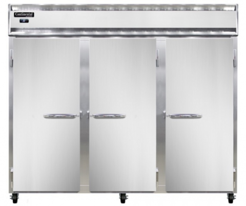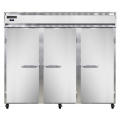 Extra-Wide Refrigerator, 75 cu. ft. capacity, pass-thru, 85-1/2" wide three-section, self-contained refrigeration, standard depth, full-height solid doors on front, full-height glass doors on rear, electronic controller with digital display, electric condensate evaporator, stainless steel front, aluminum interior & ends, 5" casters, NEMA-5-15P, 1/2 HP, cETLus, NSF, Made in the USA
