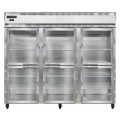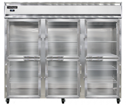 Extra-Wide Refrigerator, 75 cu. ft. capacity, pass-thru, 85-1/2" wide three-section, self-contained refrigeration, standard depth, half-height glass doors on front, half-height solid doors on rear, electronic controller with digital display, electric condensate evaporator, stainless steel front, aluminum interior & ends, 5" casters, NEMA-5-15P, 1/2 HP, cETLus, NSF, Made in the USA